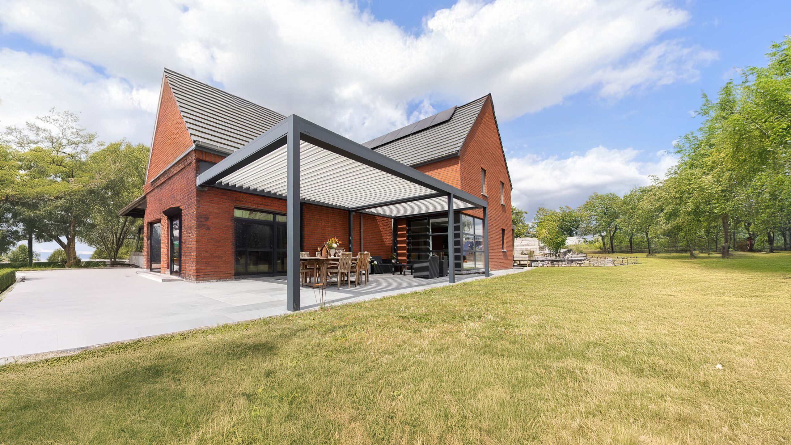 Das Lamellendach Brustor B200 XL kombiniert modernes Design mit höchster Funktionalität. Die breiten Aluminiumlamellen mit 16 oder 21 cm ermöglichen mehr Lichteinfall im geöffneten Zustand und sorgen für eine stilvolle Optik. Durch das automatisierte Dach können die Lamellen flexibel geöffnet, gekippt oder geschlossen werden – für eine individuelle Steuerung von Sonneneinstrahlung und Schutz vor Regen.